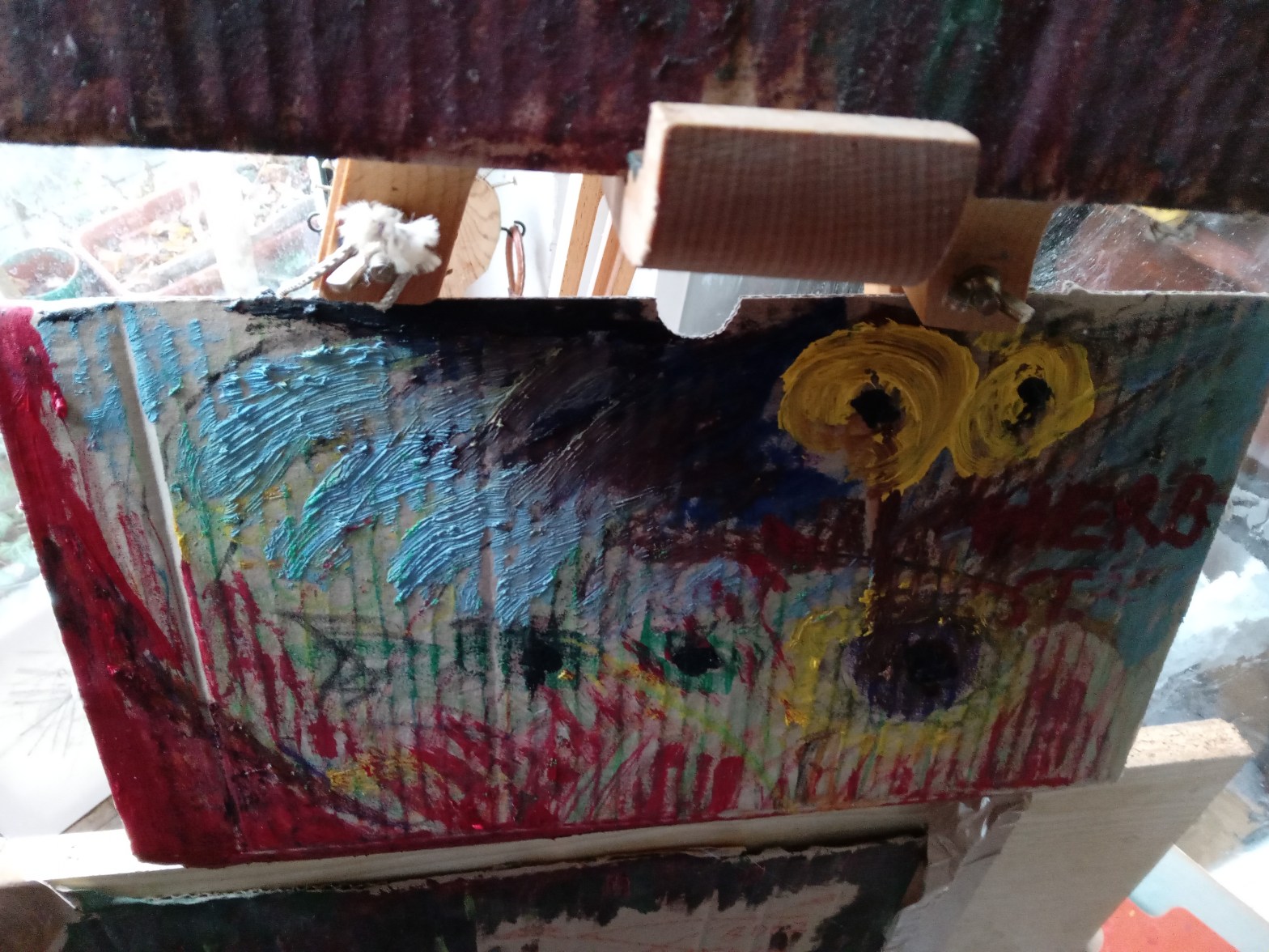 Lasst Euch nicht stören von der Eierkiste aus Pappe. Alles ist Pappe, vergänglich. Meine Pappenreste, auf die ich Bilder bringe und aufhebe, bis sie zur Galerie werden, zur Galerie der Vergangenheit.