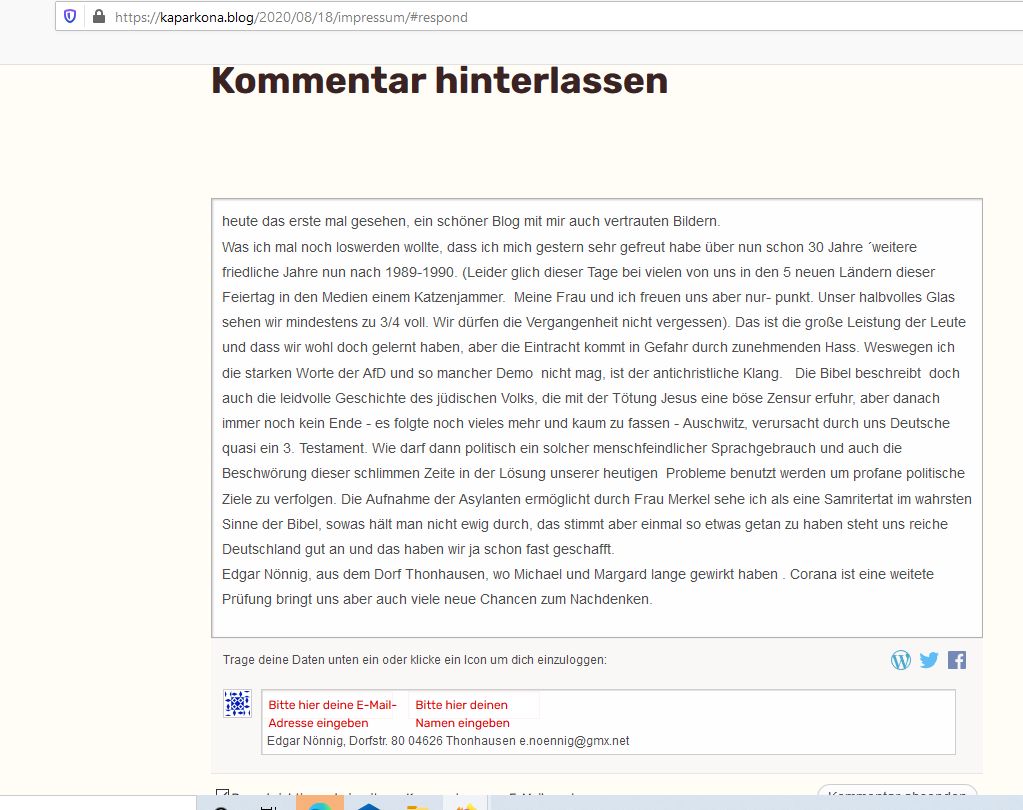 Am Tag der Deutschen Einheit haben wir uns aufgemacht und sind bei schönem Wetter in die Innenstadt Berlins gefahren. Unser Ziel: Anklamer Straße. Dort konnten wir gut unseren roten Käfer abstellen, dachten wir. Aber da meine Frau Margard nicht so sehr gerne läuft, sind wir um die Ecke gebogen, die ehemalige Egon – Schulz – Straße hoch gefahren, sehr nahe an die ehemalige Grenze mitten in Berlin. Dort war auch noch eine Lücke. Und feiertags keine Parkgebühren. Die Glocken läuteten schon. Jetzt draußen auf dem Roggenfeld die Glockentürme mit drei GLocken. Aus der gesprengten Versöhnungskirche? Das wissen wir nicht. Andere Teile wie Altar, Stuckelemente sind aufgehoben und aus- bzw. wieder aufgestellt in der neuen Versöhnungskapelle aus Holz. Alles ein paar Schritte abwärts. Die Strelitzer (Schulz) – Straße links abbiegen, die Bernauer entlang, weil da Sonne ist gegen 11.00 Uhr am 3.Oktober 2020. Dreißig Jahre Wiedervereinigung. Gefeiert in unserem Kietz (von 1969 bis 1975) ohne dreifache Mauer, nur noch die Grundrisse aus Stahl, gegossen in die Wiese hinein, des Regimes, des GRENZREGIMES, sichtbar. An den Stirnwänden Richtung Süden: z.B.Ackerstraße, die dramatischen Szenen der Flucht. Auf der Westseite die Bernauer Fassaden WEST. Nie gesprengt. Wie die Versöhnungskirche, wie die andere Seite der Straße: OST. ALso draußen CORONA. Ein farbiger Prediger aus Neukölln mit seiner Band. Mir genügt das Offene HOLZZELT mit dem Altar der neogotischen Versöhnungskirche, hergegeben 1975 in einem DEAL die Evangelische Kirche in Berlin für ein Grundstück in dem Stadtteil, in dem unsere ersten beiden Kinder geboren wurden: Kaulsdorf, damals Ortsteil Berlins, Hauptstadt der Deutschen Demokratischen Republik. Dort steht jetzt seit über 5o Jahren eine ähnliche Kirche aus ähnlichem Material wie die NEUE VERSÖHNUNGKIRCHE AUF DEM EHEMALIGEN GRENZSTREIFEN ZWISCHEN BERLIN-OST UND BERLIN-WEST. Nach dem Fall der Mauer errichtet. Ich sitze in dieser Kapelle und bin froh, daß die Kirchen ihre Türen aufmachen. Jetzt müssen sie es, endlich, weil es draußen noch gesünder ist, zu singen. Draußen wird gebetet, gesungen. Der Prediger ist noch nicht am Ziel, ich aber gehe die Stufen hinunter Richtung Süden. Da ist ein Friedhof mit einem Kreuz, gestiftet von Friedrich Wilhelm IV. Wunderbar als Vordergrund, wenn du rückwärtsgewandt den Holzrundbau in‘ s Bild bekommen willst, ein wenig verstellt mit Containern und ihren Aufschriften: ANTIFA. –