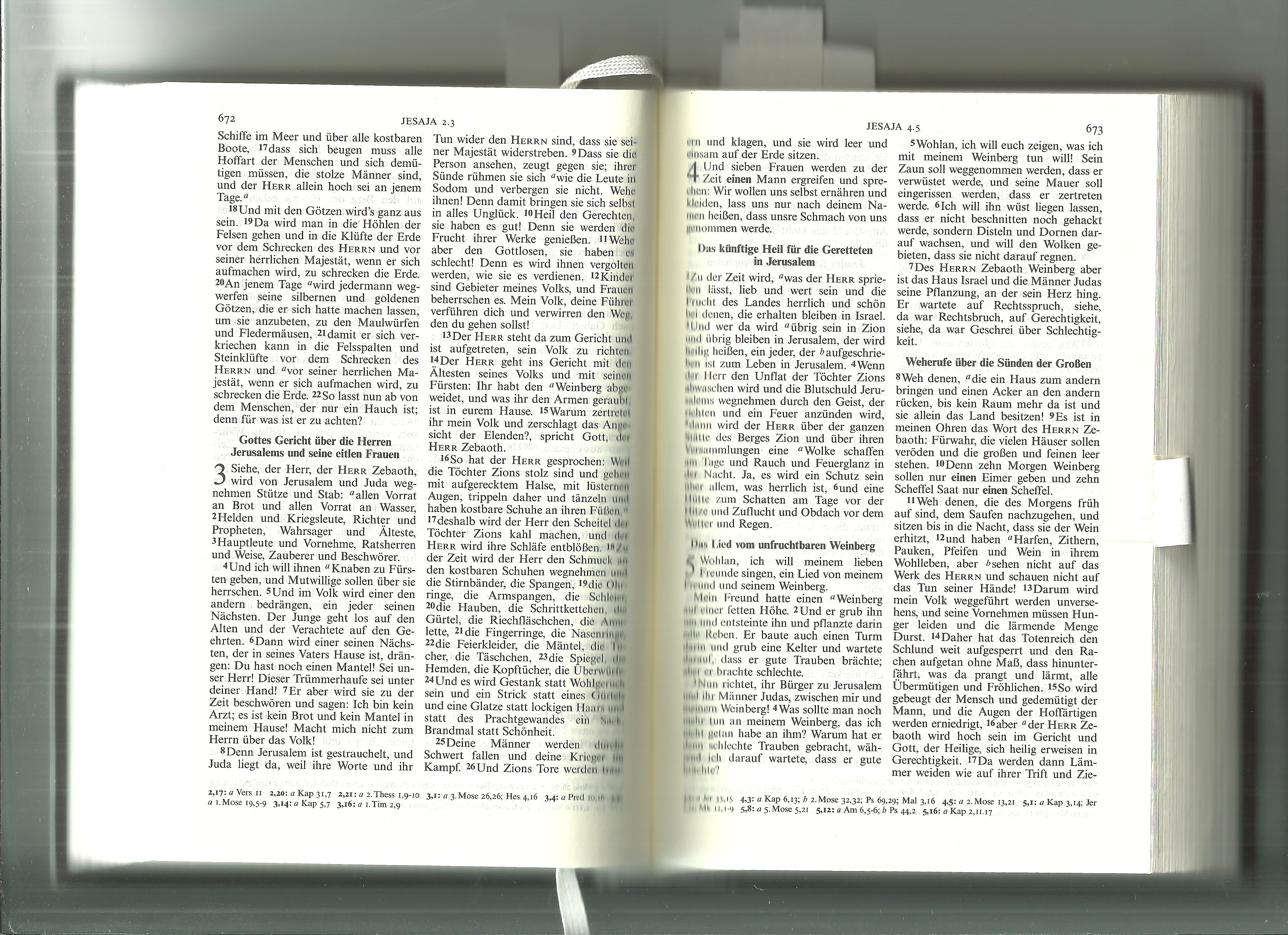 1. Lieber Michael, ich habe das Weinberglied in gewisser Weise als Gleichnis auf die aktuelle Verfasstheit unseres Landes gelesen: „20. Weh denen, die Böses gut und Gutes böse heißen, die aus Finsternis Licht und aus Licht Finsternis machen, die aus sauer süß und aus süß sauer machen! 21. Weh denen, die bei sich selbst weise sind und halten sich selbst für klug! … 32. die den Gottlosen gerechtsprechen um Geschenke willen und das Recht der Gerechten von ihnen wenden! … 26. Denn er wird ein Panier auswerfen unter den Heiden und dieselben locken vom Ende der Erde. Und siehe, eilend und schnell kommen sie daher, … 30. und werden über sie brausen zu der Zeit wie das Meer. Wenn man dann das Land ansehen wird, siehe, so ist’s finster vor Angst, und das Licht scheint nicht mehr oben über ihnen.“ War das auch Teil Deiner Auslegung?