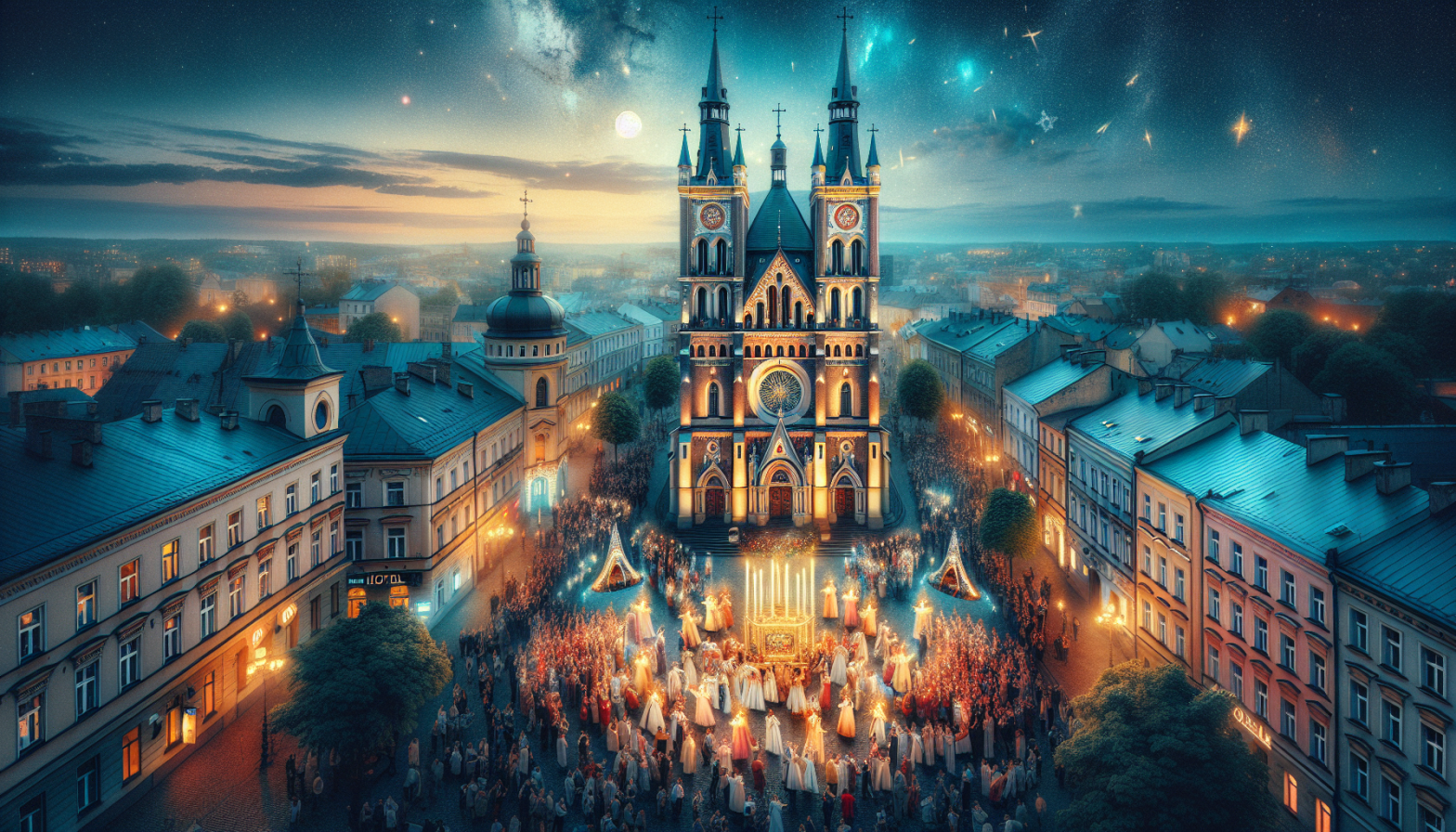 Abfahrt Tal, Gottesdienst – Offizium, Fahnen, groß-artiger HallelujaChor, Markt. Buden.